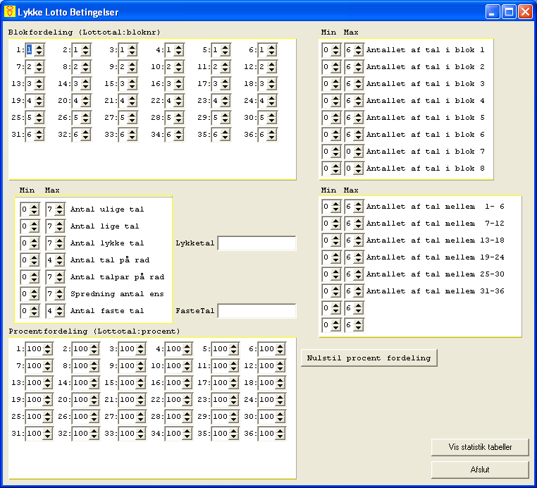 I programmet kan der opsættes betingelser for utrolig mange ting, se nedenstående eksempel: Samtidig kan du angive hvor mange rækker du ønsker, det kan være 10 eller måske 5000 rækker. Med spredning kan det sikres, at rækker f.eks. har 2 tal til forskel, dette gør at man kan opnå en ret god dækning.
