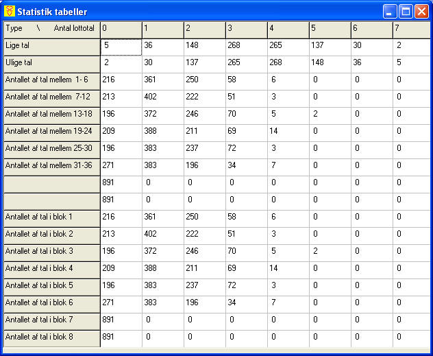 Du kan se hvilke tal der ikke er udtrukket ret tit eller hvor tit har et bestemt lotto tal været udtrukket og du kan også se hvilke grupper der er udtrukket mest.