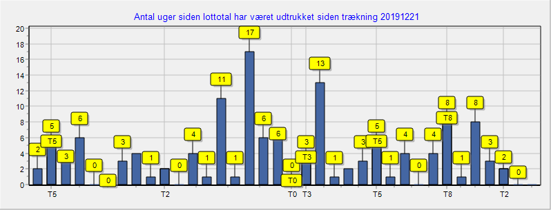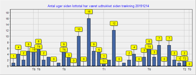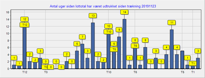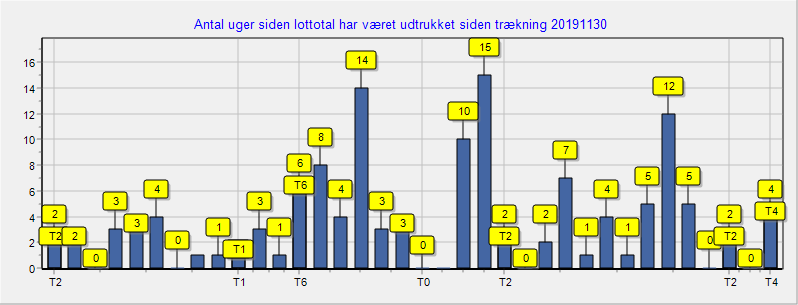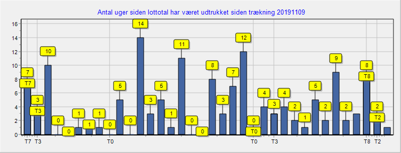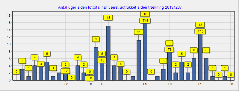 Nedenunder kan du se hvor mange uger lotto tallet ikke har været udtrukket. Den første graf viser hvor mange gange lotto tallet ikke har været udtrukket siden sidste trækning, de næste 10 grafer viser hvorledes det så ud forinden trækningen og de blå søjler / gule bokse med T viser den uge trækning.