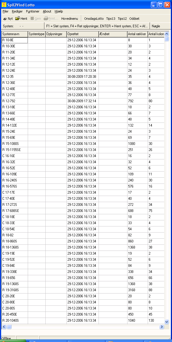 Med Lotto programmet kan du danne dine egne systemer ved indtastning, ved import af systemer fra tekstfiler eller bruge nogle af de over 60 lotto systemer er lagt ind, se nedenstående.
